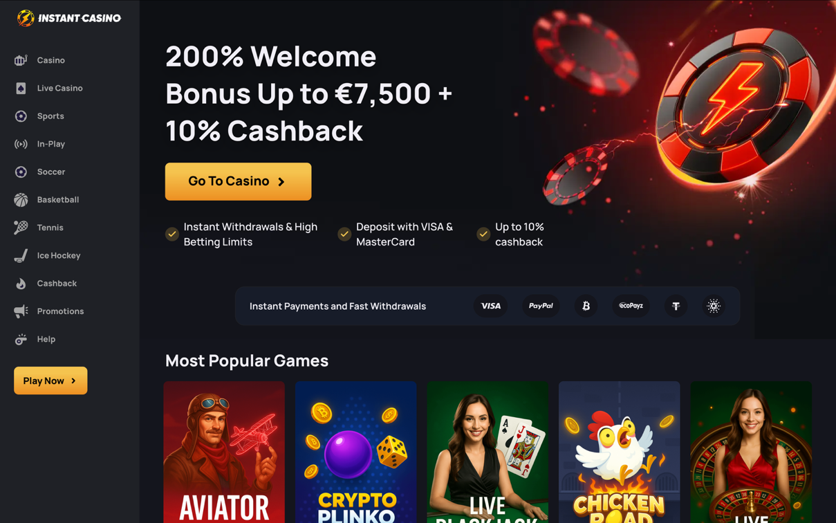 Instant Casino در سال ۲۰۲۵ بهعنوان سریعترین آنلاین کازینو برای پرداختها شناخته میشود و همین ویژگی آن را برای بازیکنان ایرانی جذاب کرده است. بیش از سه هزار بازی شامل اسلاتهای متنوع، میزهای زنده و عناوین اختصاصی، همراه با بونوس خوشامد ۲۰۰٪ تا سقف ۷۵۰۰ یورو و کشبک هفتگی ۱۰٪ بدون شرط گردش، شرایطی عالی برای شروع فراهم میکنند. برداشتهای آنی، سقفهای بالای شرطبندی، تورنمنتهای میلیوندلاری و مجوز معتبر کوراسائو، ترکیبی از سرعت، امنیت و هیجان را به بازیکنان ارائه میدهد و Instant Casino را به گزینهای مطمئن و کامل در میان رقبای خود تبدیل کرده است.