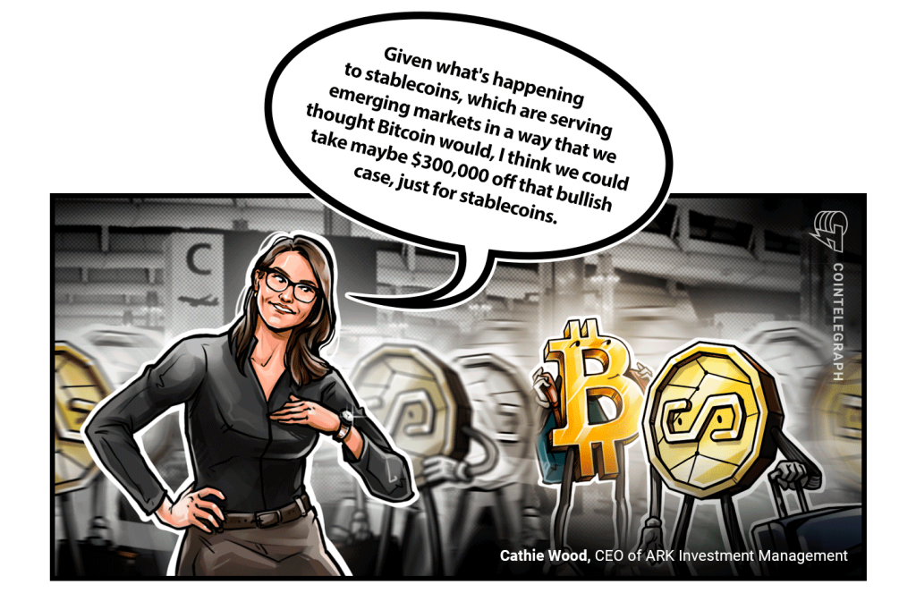 Cathie Wood drops BTC forecast by $300K, says stablecoins eroding market share