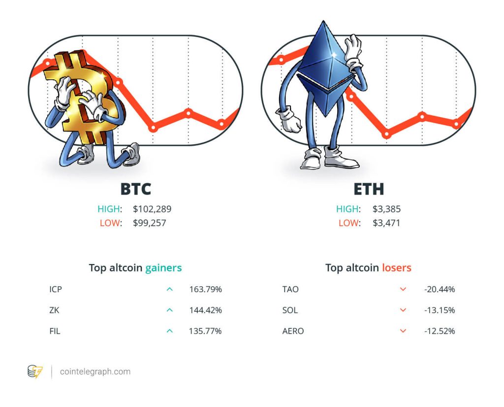At the end of the week, Bitcoin (BTC) is at $102,289, Ether (ETH) at $3,385 and XRP at $2.30. The total market cap is at $3.44 trillion, according to CoinMarketCap.