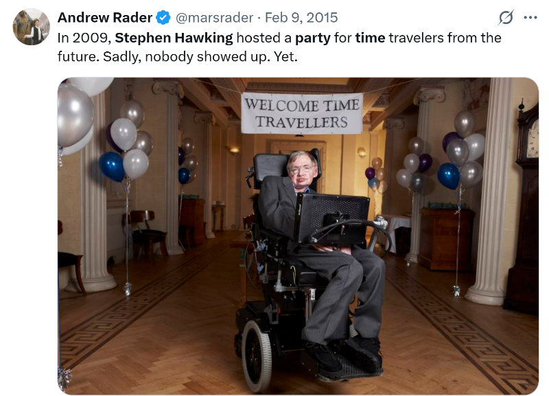 In 2009, Stephen Hawking hoped to entice a few to show up to his time traveller’s party with champagne and nibbles — but nobody turned up.